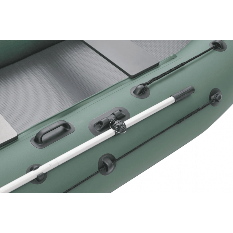 Модель оснащена инновационным надувным дном высокого давления AirDeck, которое по жесткости не уступает алюминиевому настилу, но при этом значительно легче и компактнее при транспортировке.