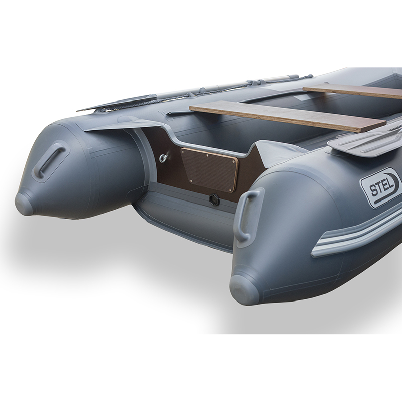 Надувная лодка Stel 03-360НD (НДНД) - транцевая килевая лодка с надувным дном низкого давления для семейного отдыха на воде на достаточно продолжительные по расстоянию переходы, с использованием бензинового или электрического двигателя мощностью от 10 л.с. до 15 л.с., на 4 человека.